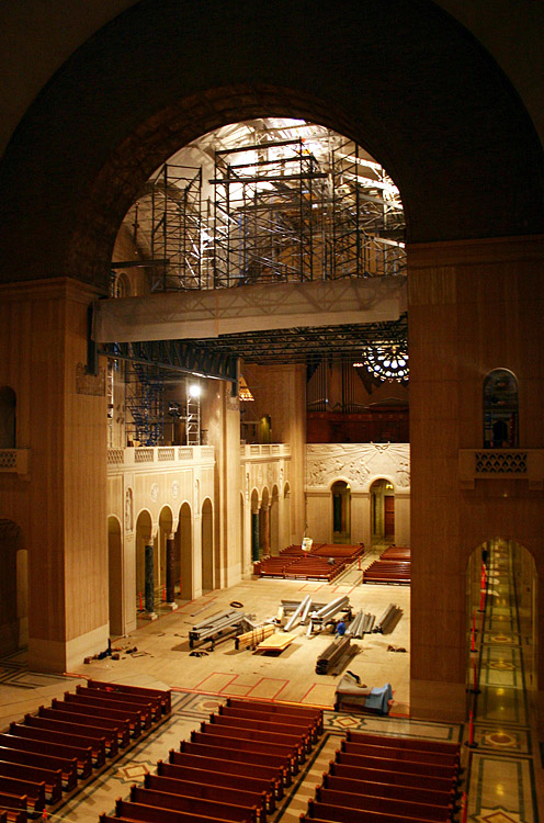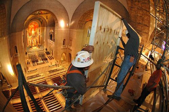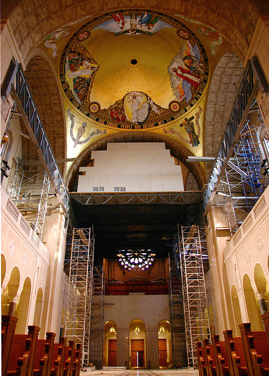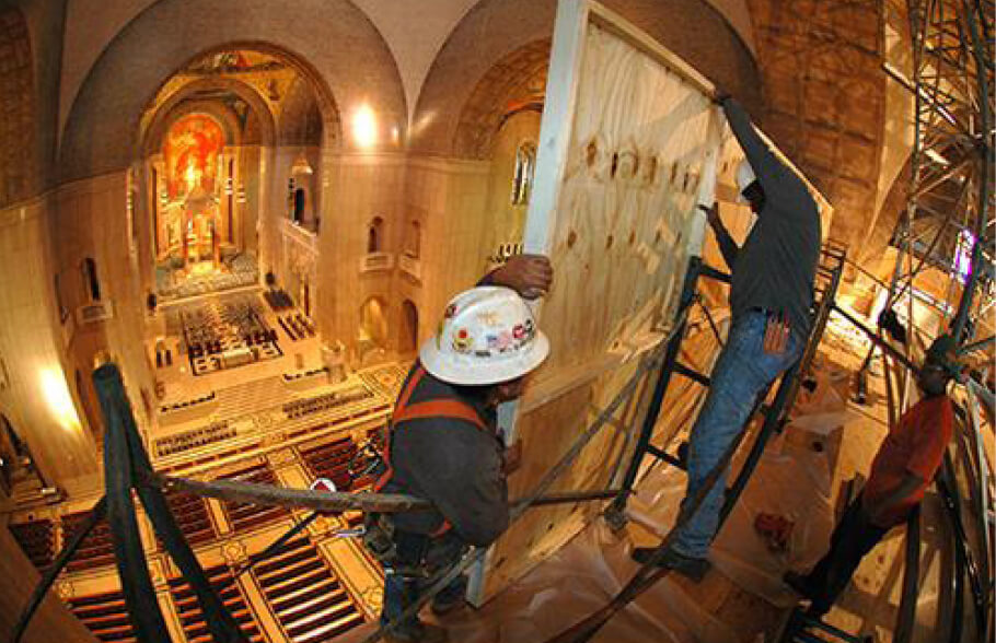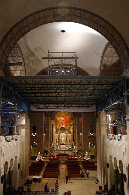 UBS was able to accommodate the Shrine’s request to stay open for regular services throughout the renovation by designing a scaffold that was supported from the Shrine’s main columns. This was done using two large collector trusses, weighing approximately 12,000 pounds each. An elaborate roller system allowed the scaffold platform to travel atop the trusses from the Redemption Dome to the Incarnation Dome.